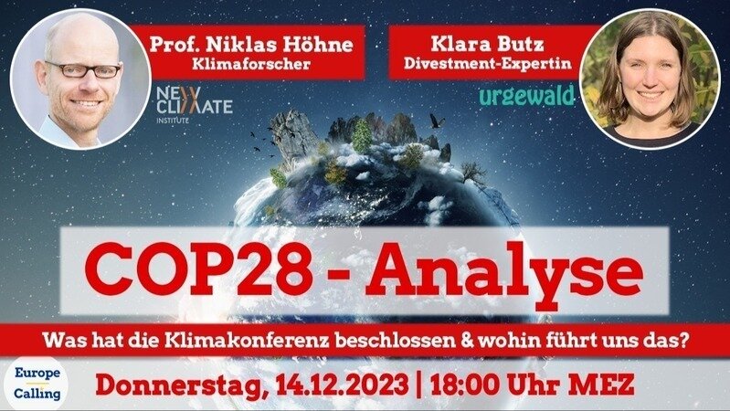 Die 28. Weltklimakonferenz wird in den nächsten Stunden enden. Ergebnis? Völlig offen. Egal wie es ausgeht, Europe Calling e.V. lädt zur Analyse mit Top-Klimaforscher Niklas Höhne und Divestment-Expertin Klara Butz von urgewald. Das ist der Termin am Donnerstag für alle, die verstehen wollen, was in Dubai beschlossen wurde - oder was nicht. Anmeldung hier: https://t1p.de/vsbnu