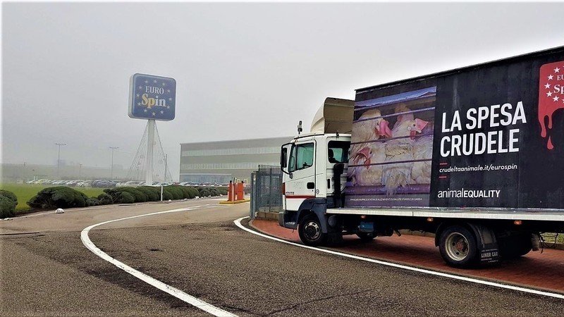 Animal Equality ha posizionato un camion vela di 6 metri per 3 metri con la scritta “La spesa crudele” proprio davanti alla sede centrale di Eurospin al fine di denunciare l’azienda per la vendita di uova di galline allevate in gabbia.