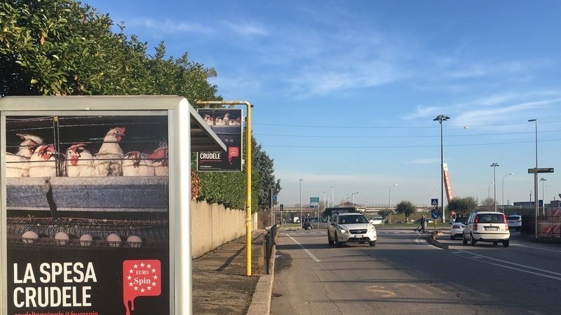 Animal Equality ha installato affissioni recanti il logo insanguinato di Eurospin insieme ad immagini rappresentative di allevamenti italiani di galline ovaiole allevate in gabbia e lo slogan “la spesa crudele” in tutte le pensiline e tutte le fermate dei mezzi pubblici che servono il comune di San Martino Buon Albergo, dove si trova la sede centrale dell’azienda, con il fine di denunciare Eurospin per la vendita di uova provenienti da galline allevate in gabbia.