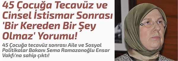 Sema Ramazanoglu, the minister who is responsible for Family and Social Affairs in Turkey, recently made remarks suggesthing that it was OK for children to be molested and raped at the Ensar Foundation, as long as it happens just once!! She is the person who is responsible for family and social affairs and yet she acts as the spokes person of the Ensar Foundation, which apparently is the house of child molestation and rape. Recently, more than 45 children were reported to be raped at this institution and the institution apparently bribed 10 families to keep silent about the event.