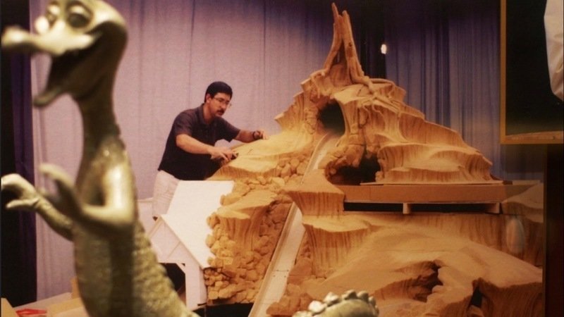 John Stone works meticulously on the study model for Splash Mountain in 1987. Also in view is a maquette of the Hitchhiking Alligator #SplashMountain #Disneyland #WaltDisneyWorld