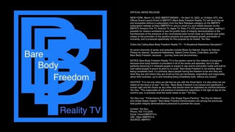 NEW YORK, March 10, 2022 /BBFRTVNEWS/ -- On April 10, 2022, at 12:00am UTC, the Official Grand Launch Event of BBFRTV (Bare Body Freedom Reality TV) will be on the air and accessible without a subscription from the New Releases category on the BBFRTV subscription website at https://BBFRTV.tv and on smart tv‘s and mobile devices via the BBFRTV Amazon Fire TV, Android TV, Apple TV, Roku TV, iOS and Android apps, making it possible for viewers worldwide to see the prolific body of integrity demonstrations of the harmlessness of the presence of the nonchalantly bare human body as it directly and solely relates to the promotion of the positive physical and psychological growth and health of humanity, and is produced specifically for this purpose by its creator, Ton Dou. - Critics Are Calling Bare Body Freedom Reality TV - “A Situational Nakedness Sensation!”. - Its seven channels of series and episodes include Music Au Naturel, Dance Au Naturel, Fitness Au Naturel, Situational Nakedness, Naked Crime Scene, Code Bare, and the Bare Body Freedom, because … journey, book and documentary. - NOTES: Bare Body Freedom Reality TV is the perfect name for this network of programs because bare body freedom is prevalent in all of the series and episodes, but it is also perfectly deceiving if it misleads people to expect to see end-to-end public nudity and wall-to-wall naked people to prove its point to no avail! Bare Body Freedom is not entirely about being completely bare, it is primarily about people having the freedom to be who they are, what they are and where they are at-will as they go harmlessly, respectfully and responsibly about their business, up to and including being completely bare, without any issues! - QUOTES: "It is not only when we die that we are with the Great Spirit, it is also when we are naked on the land or at sea." Ton Dou "Bare Body Freedom is as natural and significant a human right and life choice as any other and should never be legislated as criminal behavior." Ton Dou "The responsible at will practice of wholesome nakedness in the light of day for the world to see, is precisely what the world needs to see." Ton Dou - Ton Dou Live * Performance Premiere, City-Scape Figure-Painting * Ton Dou Au Naturel and United States Capitol * Bare Body Freedom Demonstration are among the previously held public integrity demonstrations produced to promote the cause. - Contact: Ton Dou - Phone: 702 715 2378 - Email: Crew@BBFRTV.tv - URL: https://BBFRTV.tv - SOURCE: BBFRTV