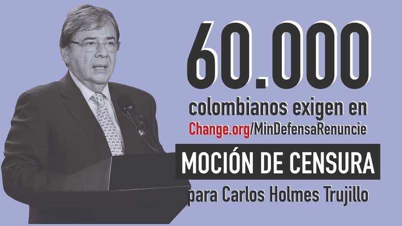 “Más de 60 mil colombianos en Change.org/MinDefensaRenuncie apoyamos de forma rotunda la moción de censura contra Carlos Holmes Trujillo porque NO confiamos en su gestión. #MinistroHolmesRenuncieYa #MinistroDeLaInfamia”