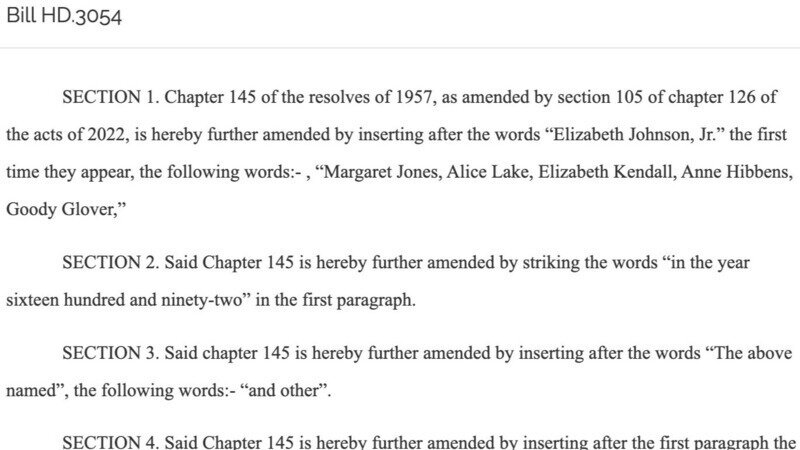 Today, HD.3054 An Act exonerating certain individuals accused of witchcraft in colonial Massachusetts was filed to the Massachusetts General Court by Representative Steven Owens 29th Middlesex - Consisting of Ward 9, Ward 10 Precincts 1, 3, Ward 11 Precincts 1A, 2, and 3A, of the city of Cambridge, and Precincts 1, 2, 3, 4, 5, 6, 7, and 8, of the city known as the town of Watertown, in the county of Middlesex.
