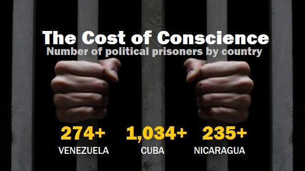 Partial lists provided by internal human rights groups indicate that there are at least 1,034 political prisoners in Cuba, 235 political prisoners in Nicaragua, and 274 political prisoners in Venezuela spending the holiday season behind bars. At a minimum 1,543 fellow humans are arbitrarily detained and being subjected to cruel and unusual punishment for matters of conscience.