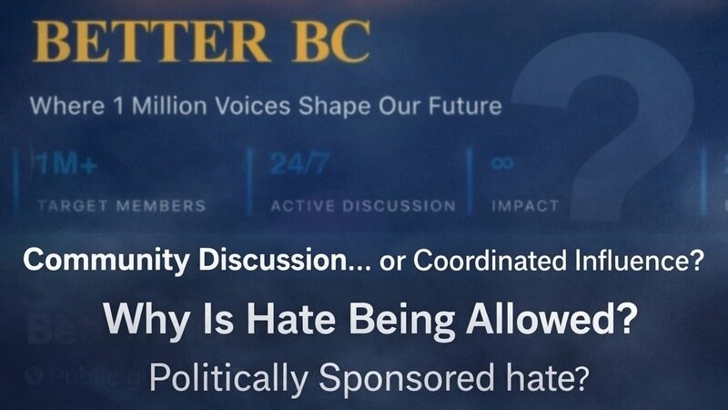 Taken together, this raises concerns that the group may be operating as an undeclared third-party political communication channel, shaping political opinion without transparency or disclosure, particularly as British Columbia approaches an election period.
