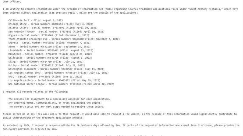 However, the prolonged delays in processing these applications have created significant uncertainty, severely hindering our ability to move forward with essential marketing and partnership strategies. The lack of clarity regarding why these applications have been relegated to a specialist assessor is not only frustrating; it is detrimental to the growth of soccer in the U.S. As a proactive measure, I have also invoked the Freedom of Information Act (FOIA) to demand transparency and accountability from the USPTO regarding the status of my applications.