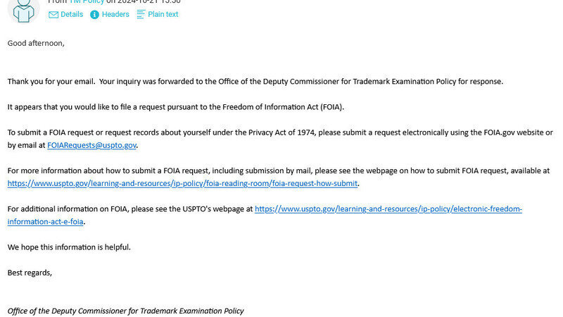 The USPTO's response was both encouraging and informative, offering clear instructions on how to submit a FOIA request either electronically or via email. It outlined the steps necessary for obtaining access to records that could shed light on the reasons behind the processing delays we’ve encountered.