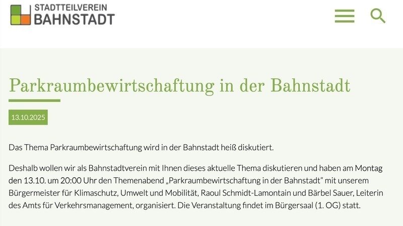 Ich möchte auf ein Event des Stadtteilvereins Bahnstadt hinweisen, das am kommenden Montag den 13.10. um 20:00 Uhr im Bürgerhaus am Gadamerplatz zum Thema Parkraumbewirtschaftung stattfindet. Je mehr Menschen sich an einer sachlichen Diskussion beteiligen, desto besser.