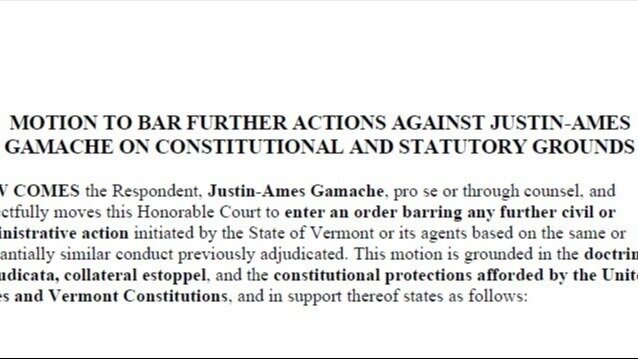 NOW COMES the Respondent, Justin-Ames Gamache, pro se or through counsel, and respectfully moves this Honorable Court to enter an order barring any further civil or administrative action initiated by the State of Vermont or its agents based on the same or substantially similar conduct previously adjudicated. This motion is grounded in the doctrines of res judicata, collateral estoppel, and the constitutional protections afforded by the United States and Vermont Constitutions, and in support thereof states as follows: