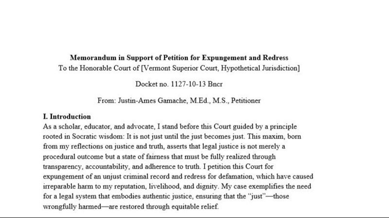 As a scholar, educator, and advocate, I stand before this Court guided by a principle rooted in Socratic wisdom: It is not just until the just becomes just. This maxim, born from my reflections on justice and truth, asserts that legal justice is not merely a procedural outcome but a state of fairness that must be fully realized through transparency, accountability, and adherence to truth. I petition this Court for expungement of an unjust criminal record and redress for defamation, which have caused irreparable harm to my reputation, livelihood, and dignity. My case exemplifies the need for a legal system that embodies authentic justice, ensuring that the “just”—those wrongfully harmed—are restored through equitable relief.