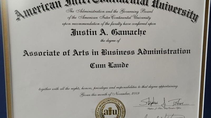 Photograph of an official diploma awarded to Petitioner by American InterContinental University, conferring the degree of: