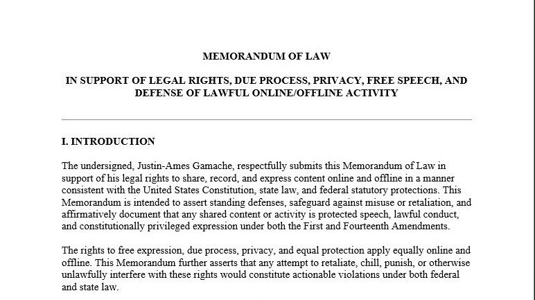 The undersigned, Justin-Ames Gamache, respectfully submits this Memorandum of Law in support of his legal rights to share, record, and express content online and offline in a manner consistent with the United States Constitution, state law, and federal statutory protections. This Memorandum is intended to assert standing defenses, safeguard against misuse or retaliation, and affirmatively document that any shared content or activity is protected speech, lawful conduct, and constitutionally privileged expression under both the First and Fourteenth Amendments.
