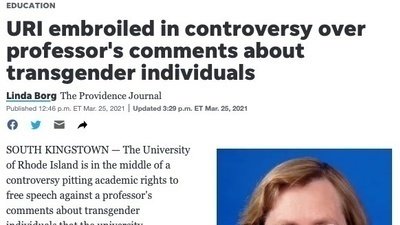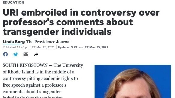 Currently she believes that she is protected by the first amendment, but free speech does not include hate speech. Her work only incites further violence and abuse against trans people and goes against our work towards an inclusive and safe environment at URI. The Providence Journal reports these direct quotes;