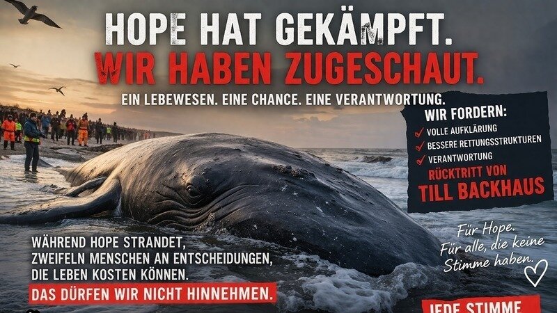 Zahlreiche engagierte Menschen sowie internationale Beispiele zeigen, dass es Methoden gibt, gestrandeten Großwalen zumindest eine Chance auf Rettung zu geben – etwa durch Auftriebssysteme, Spezialschiffe oder internationale Rettungsteams. Viele Bürgerinnen und Bürger stellen sich deshalb die berechtigte Frage: Wurde im Fall von Hope wirklich alles versucht?