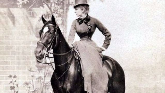 Photo is vintage image of a woman riding sidesaddle, like Ella Hurst and Joy Markhm used to do in the Fayetteville Homecoming parades in the 1950s.