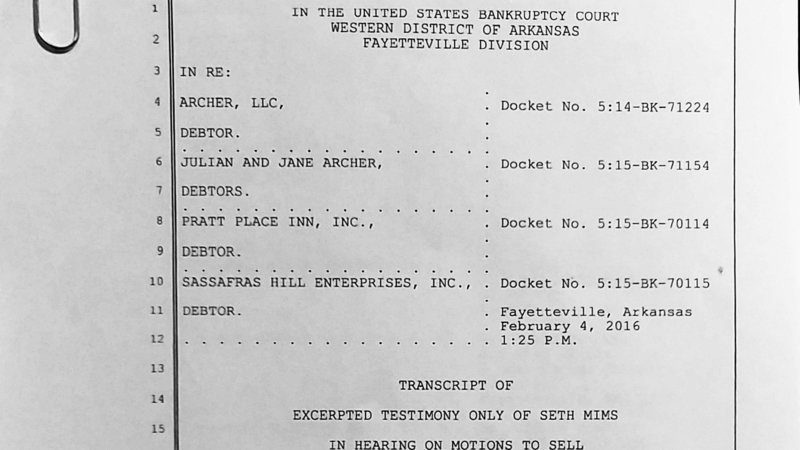 Seth Mims was Specialized Real Estate Group’s (SREG) representative for the out-of-state money (RMD Properties/Robert M Dant) used to purchase in cash the Markham Hill property, not at the appraised value but at the amount owed to Simmons First National Bank to resolve the bankruptcy trial. Seth Mim’s promises were made on the stand under oath on February 4, 2016 before the Honorable Richard D. Taylor in the United States Bankruptcy Court, Western District of Arkansas, Fayetteville Division. I have the entire transcript of Mr. Mims’ testimony for anyone who wants it. Excerpts follow: