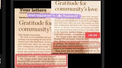 Lillia's father also got an old couple in Ohio to send thank you message to Tampa Chief of Police and the CEO of Tampa General Hospital for their visit to offer condolences. Now why is that? This article was published in 2018. Refer to the article image of this petition.