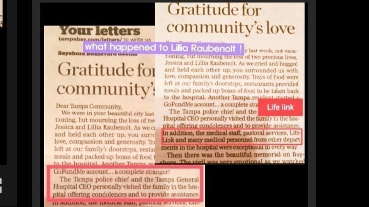 Please comment if you need to see the Instagram proof of Jessica Raubenolt posting of Lillia's stomach cancer, News article obtained from Uncle John Reisinger SMS published the visits from Tampa Chief of Police and CEO of Tampa General Hospital. I will be happy to direct you to the proofs.