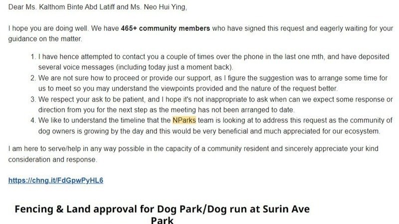 Aggiornamento sulla petizioneFencing & Land approval for Dog Park/Dog run at Surin Ave Park19 Dec 2022 - Several follow-ups attempted over the phone and email sent for next steps