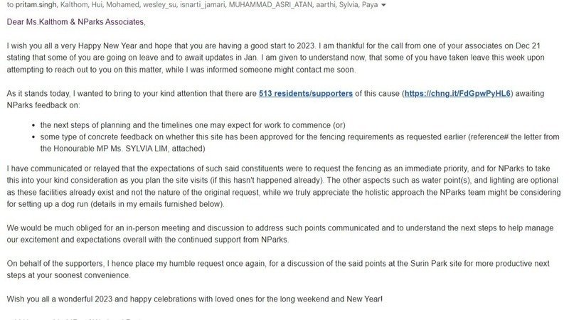 Wish you all a wonderful 2023 and hope you all are having a great start to the year. I have been following up with NParks and I am hence sharing the most recent follow-up formal request, while I have been calling the NParks team regularly, attempting to get in touch.