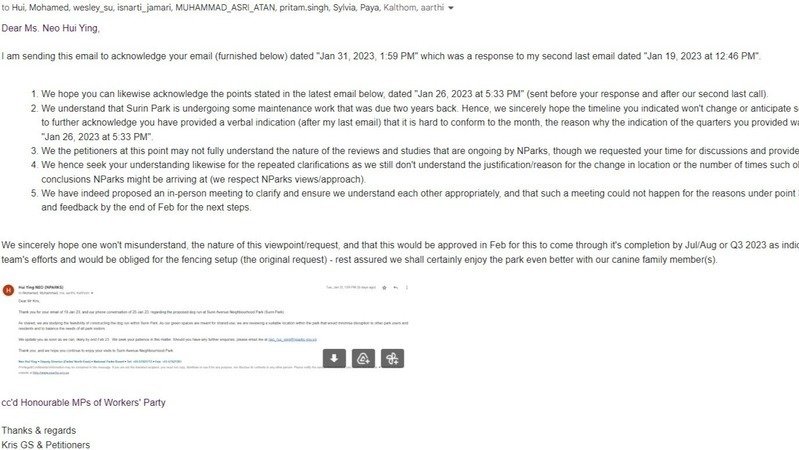 "Dear Mr Kris, Thank you for your email of 19 Jan 23, and our phone conversation of 25 Jan 23, regarding the proposed dog run at Surin Avenue Neighbourhood Park (Surin Park). As shared, we are studying the feasibility of constructing the dog run within Surin Park. As our green spaces are meant for shared use, we are reviewing a suitable location within the park that would minimise disruption to other park users and residents and to balance the needs of all park visitors.We update you as soon as we can, likely by end Feb 23. We seek your patience in this matter. Should you have any further enquiries, please email me at .... Thank you, and we hope you continue to enjoy your visits to Surin Avenue Neighbourhood Park."