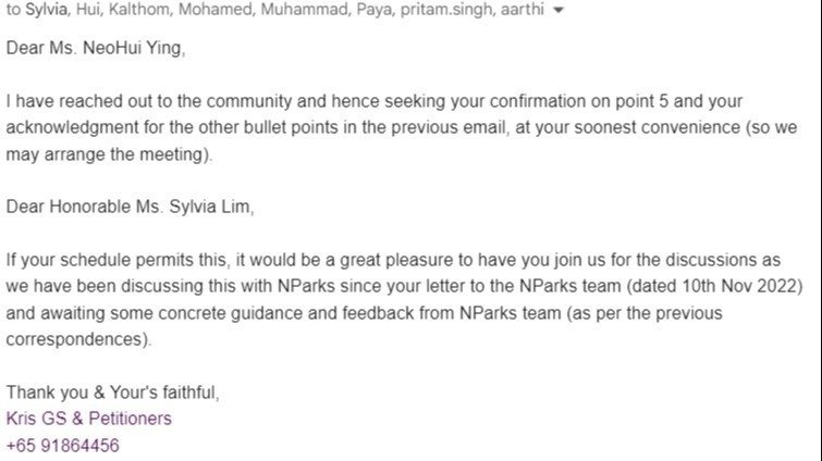You may contact me on my mobile if you are able to join the discussions and you may refer to the follow-up request sent to NParks and suggestions to the Honorable MP.