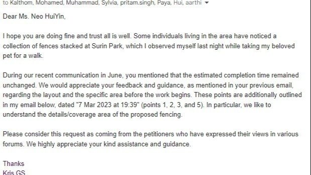 It has come to our attention that fences were observed to be stacked up at Surin Park yesterday evening. We are hence seeking clarification regarding the specific area under consideration as well as additional details such as ground leveling and the removal of footpaths.