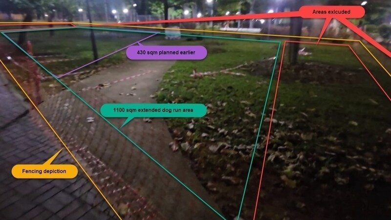 In this regard, we would like to draw your attention to the fact that there are certain areas (marked in RED) that have not been taken into consideration for the dog run, which may have been intentional, despite the visual indication from the mesh suggesting otherwise (marked in AMBER).
