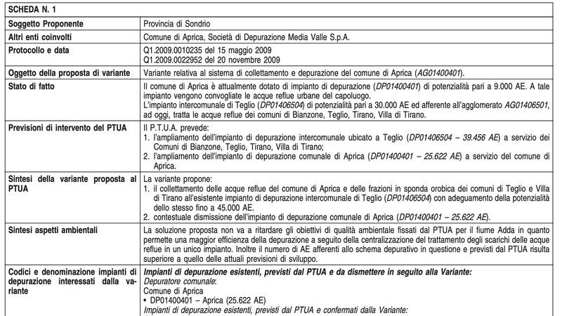 "- 1 scarico in torrente Aprica, dell’effluente depurato in uscita dall’impianto di trattamento di Aprica (codice DP01400401);
