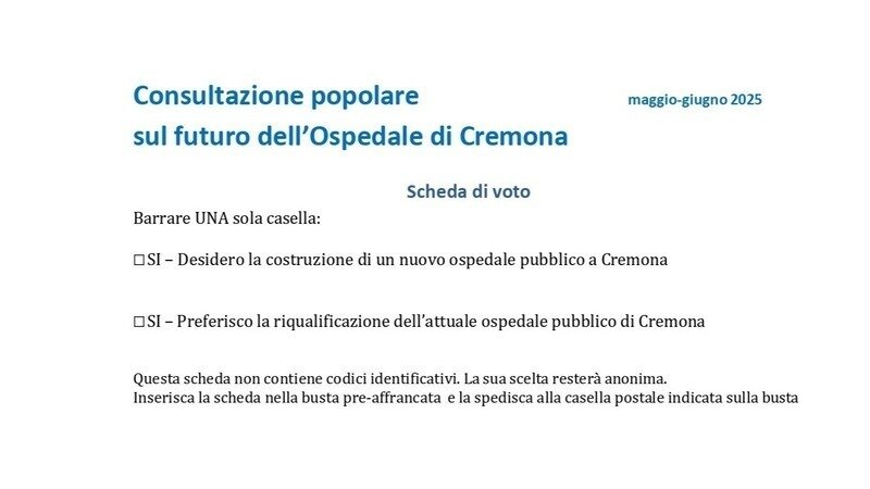 L'impegno di questi due anni ci hanno portato a scarsi risultati, è vero, ma quanto è emerso dalla CONSULTAZIONE POPOLARE dice a tutti in modo incontrovertibile che NON TUTTI i cremonesi, come sostengono i politici locali e i dirigenti sanitari locali e regionali, sono favorevoli alla costruzione di un nuovo ospedale.