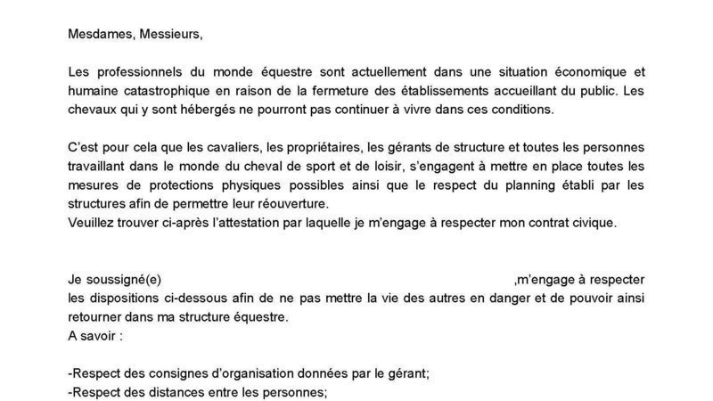 Je soussigné(e) ____________________ m’engage à respecter les dispositions ci-dessous afin de ne pas mettre la vie des autres en danger et de pouvoir ainsi retourner dans ma structure équestre.