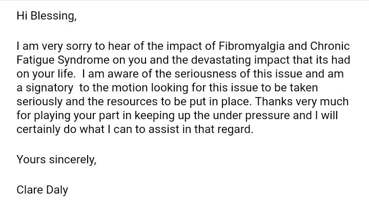 We are always interested to hear about any responses or feedback that people get from their TDs – please contact Fibro Ireland or Chronic Pain Ireland on Facebook or website if you have something you would like to report back.