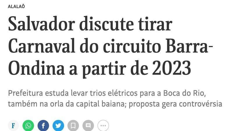 News alertEm defesa do carnaval tradicional de Salvador que é no circuito Dodô, Barra-OndinaSaiu na Folha de S. Paulo! Salvador discute tirar Carnaval do circuito Barra-Ondina a partir de 2023