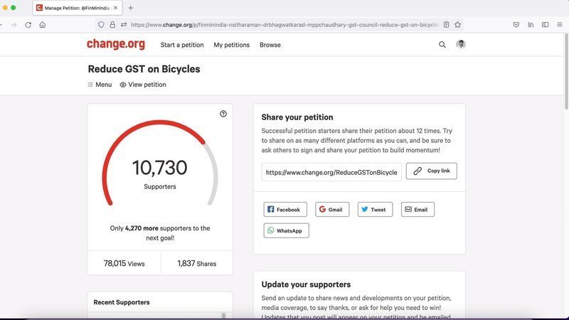 Atualização do abaixo-assinadoReduce GST on BicyclesCongrats !!! We have reached more than 10000 Signatures.