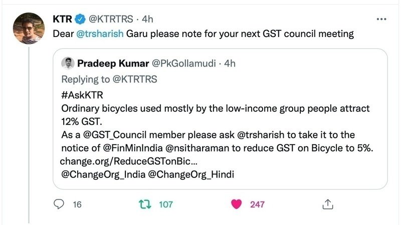 Kampanya güncellemesiReduce GST on BicyclesThanks to KTR for responding in favour of reducing GST on Bicycles