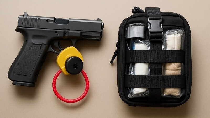 This bill aims to reduce firearm-related deaths and injuries by ensuring every firearm purchase includes safety and emergency response devices, and by requiring late-night alcohol-serving businesses to maintain lifesaving trauma kits on-site. It balances the right to bear arms with the responsibility to protect lives.