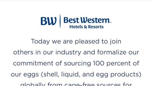 Durante la scorsa notte, la sede centrale di Best Western negli Stati Uniti ha pubblicato sulla propria pagina Facebook un nuovo impegno a prendere le distanze dalle uova di galline allevate in gabbia.