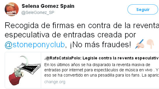 El club de fans de Selena Gomez Spain se ha sumado a la petición para la prohibición de la reventa especulativa de entradas. Muchísimas gracias!