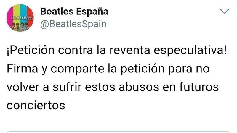 El club de fans de Beatles Spain ha compartido y se ha sumado a la petición para la prohibición de la reventa especulativa de entradas. Muchísimas gracias!