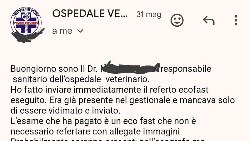 Mi è stato mandato un referto senza immagini, con data di accettazione del cane assente (il mio William è stato accettato il 23 maggio), data di creazione del referto 25 maggio, il giorno che me lo sono riportata a casa, dopo tre giorni di ricovero (55€ al giorno), con creatore e refertatore due veterinario diversi da chi me lo aveva preso in carico. E ancora, il giorno che l'ho portato a casa, il medico di turno non è riuscito a trovare sul PC l'ecografia. Io non ero sola, ma ero andata accompagnata da una mia amica, testimone dell'inutile è cerca su terminale.