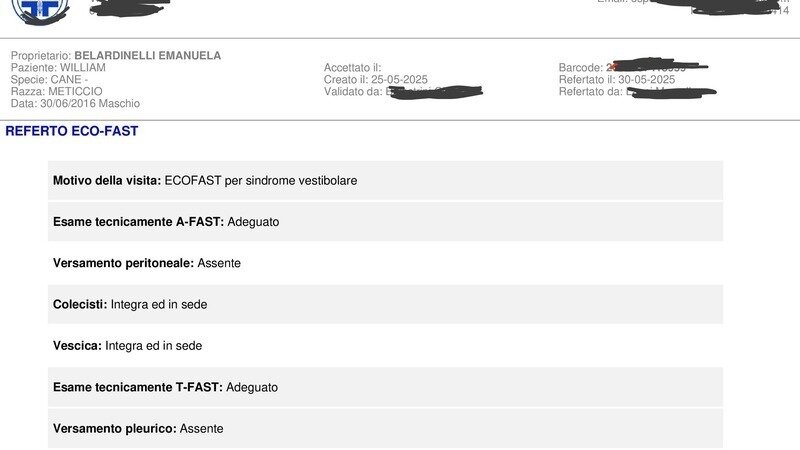 Ho portato William in data 23 maggio, l'esame in questione è una ecofast, che serve NELL' IMMEDIATO, per verificare se ci sono traumi... ripeto, il mio cane aveva un problema neurologico, che nulla ha a che vedere con traumi vari. Nel referto non c'è data di accettazione e la data di creazione, 25 maggio, corrispondente alla data in cui ho portato a casa Willy dalla struttura. Il medico che ha creato il referto, non solo non era il medico che me lo aveva preso in carico il 23, ma, addirittura, quel giorno non riusciva a trovare l'ecografia sul terminale.