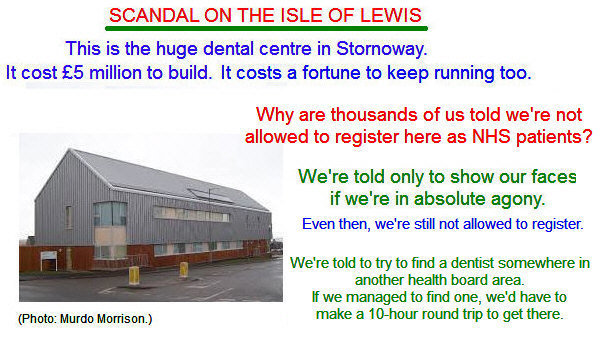 Lewis has a population of nearly 20000 people, and it also has a large hospital. Until 2014 it was possible to register as an NHS dental patient here, and it is obviously still possible if the Scottish Government decides to recognise and solve the existing problem.
