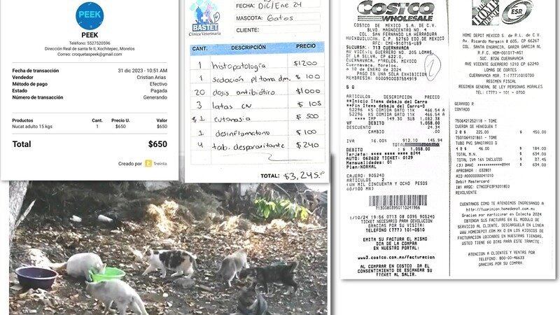Hola queridos amigos! Deseo compartir con ustedes algunos de los gastos que hemos podido cubrir gracias a su valiosa ayuda. Entre ellos están bultos de alimento, medicamentos, esterilizaciones, desparasitaciones, etc. Ayer también compré material para construiírles unas casitas y rascaderos con huacales y cambarlas por las cajas de cartón en donde duermen en el lugar que estamos rentando como refugio para los rescatados de forum, algunos faltan por ser rescatados y esterilizados. Seguimos alimentando a los feralitos sobrevivientes de Palmira que pueden ver en la foto y con urgencia debemos capturar uno muy enfermo que no ha caído en la trampa. Seguiremos intentando.