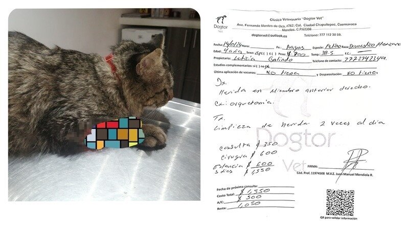 Hola queridos amigos amantes de los animalitos! Hace unas semanas apareció este gatito en Jardines de Palmira Cuernavaca, en donde habitan los sobrevivientes que alimento, pero empezó a pelear con ellos y salió muy lastimado de su patita. Como trae collar pensé que tendría dueños y lo curarían, pero resulta que no, pregunté en todas partes, pasaron los días y nadie lo curaba, la herida ya estaba muy infectada, así que con con muchos trabajos lo capturé y lo llevé a que lo atendieran pues no podía dejarlo a su suerte y pedí que se aprovechara para esterilizarlo. Lo recogí a los 3 días, pero yo tenía que seguirlo curando para no pagar mas días de pensión, pero el gatito es bravo y no me ha dejado curarlo bien pues me tira arañazos y mordidas. Aún no sana y tendré que llevarlo otra vez y que se quede hasta que terminen de curarlo. Tomé prestado lo que había para los bultos de alimento de los del refugio de los rescatados de forum y los feralitos de Palmira, pero no contaba con que serían mas gastos.