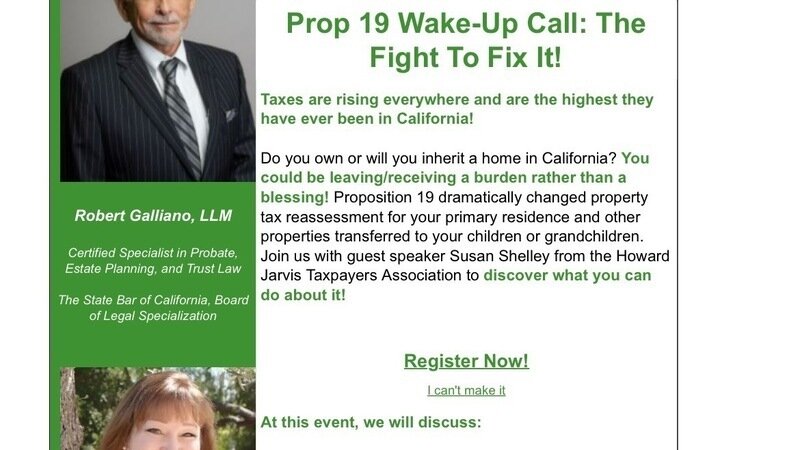 Join us to learn how you can help with this initiative to reverse the tax increase in Prop 19! If you plan to leave or inherit real property in California, don't miss this event! To register for this event, click the button below or call us at (888) 846-9095.