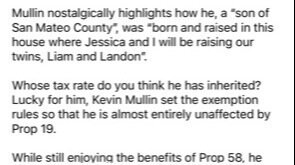 Kevin Mullin inherited his family home before prop 19 passed. He pays the previous law tax rate. He has children. Don’t vote for him. He is the author of proposition 19.