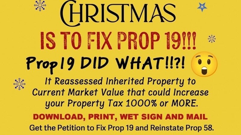 Thank you all for your interest, questions and help to #FixProp19. As we are in the midst of holiday season gatherings with family and friends, please let them know about this signature campaign. Deadline to Download, Print, Sign and Mail in Petition is January 16, 2024. The official petition may be accessed via www.ForCalifornians.com or www.RepealTheDeathTax.com Every signature counts. We need your signature and everyone in your network and your network’s contacts too! The short videos below are helpful to explain (please share!)