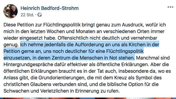 Unsere Petition beginnt zu wirken: Mehr als 35.000 haben inzwischen unterschrieben. Vielen Dank dafür! Und: In einem Beitrag auf seiner Facebook-Seite hat der Ratsvorsitzende der Evangelischen Kirche in Deutschland, Heinrich Bedford-Strohm, reagiert. Darin begrüßt er unsere Petition ausdrücklich und kündigt an, sich noch deutlicher für eine humanitäre Flüchtlingspolitik einzusetzen. Da werden wir ihn beim Wort nehmen und haben schon Kontakt aufgenommen.Bitte dankt Heinrich Bedford-Strohm für seine Unterstützung mit einem “like” und fordert ihn freundlich aber nachdrücklich in den Kommentaren zum Handeln auf: https://www.facebook.com/240505492678993/posts/1919189174810608/ Doch auch, wenn unsere Petition bereits wirkt, verbreitet sie bitte weiter. Zum Beispiel mit den Möglichkeiten hier auf der rechten Seite: https://www.change.org/fluechtlingspolitik