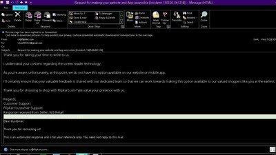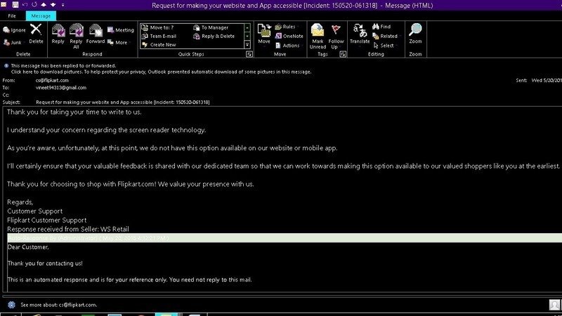 This email was also sent to me six months back with the same standard Reply. Now, please tell me that IS this not injustice to people who just want equal access. Forget about legal mandates, the cost for this is really negligible. Flipkart would need to invest a negligible part of the profits that they would earn in no time from the same untapped customers. Unfortunately it's just not a priority for flipcart like most organizations in India. I just want flipkart and all other firms to make their website and Mobile App accessible to people with visual disabilities and fulfill their right to equal access.